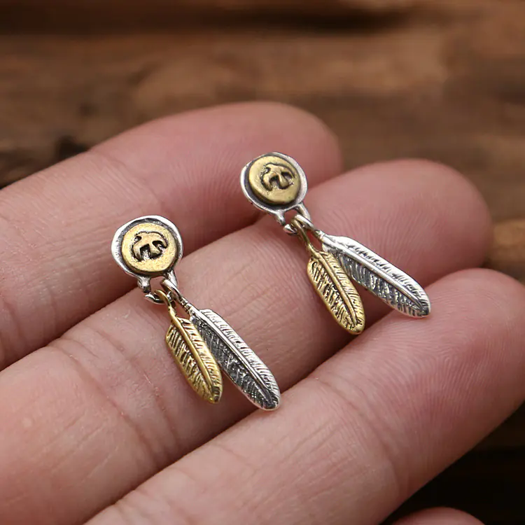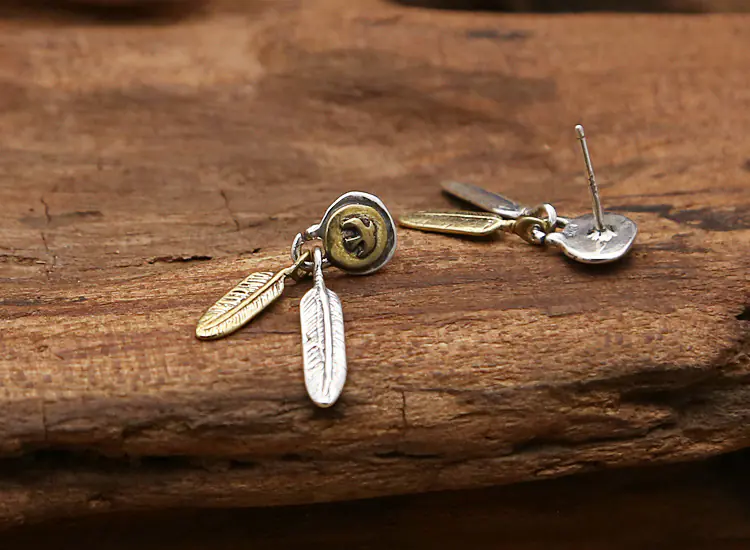 Silver Stud Earring Feather Charms Two-Tone Vintage Style 217