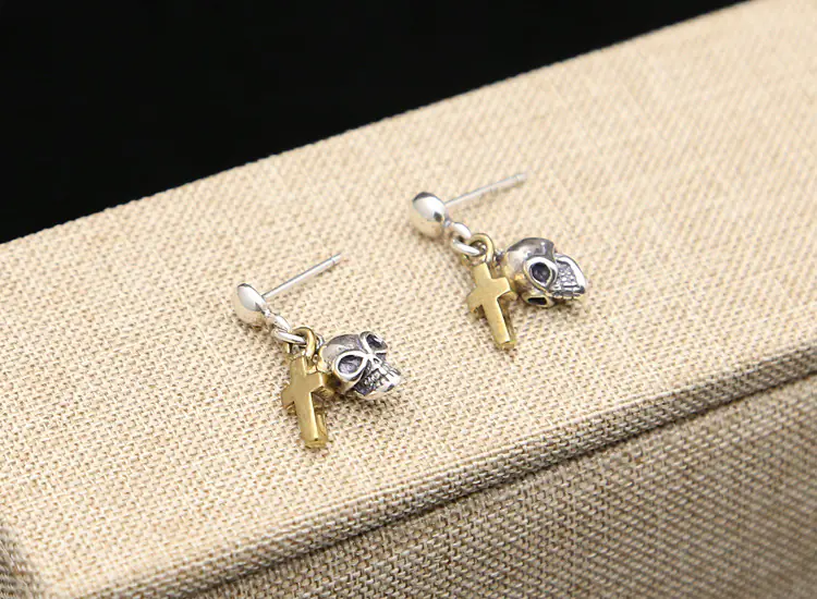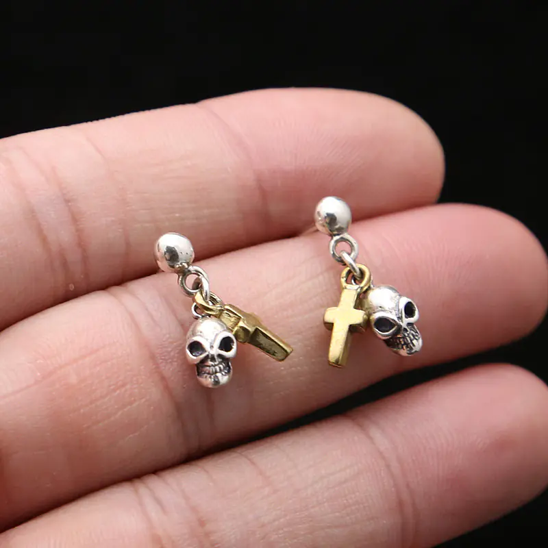 Silver Stud Earrings Cross and Skull Charms Vintage Style 218