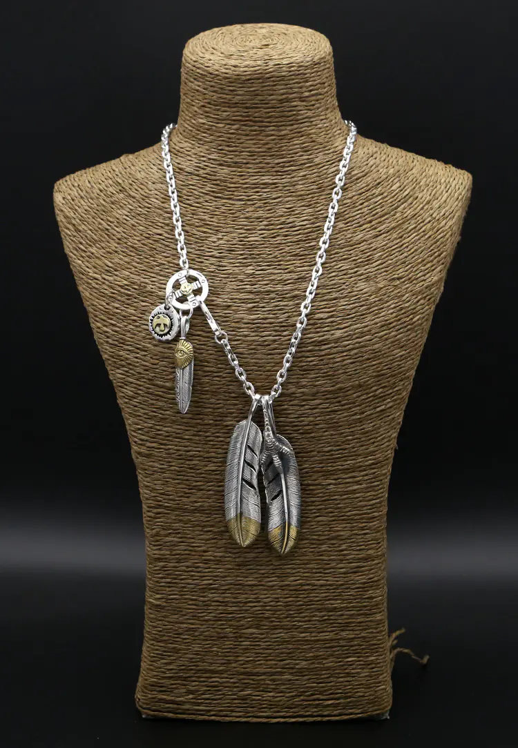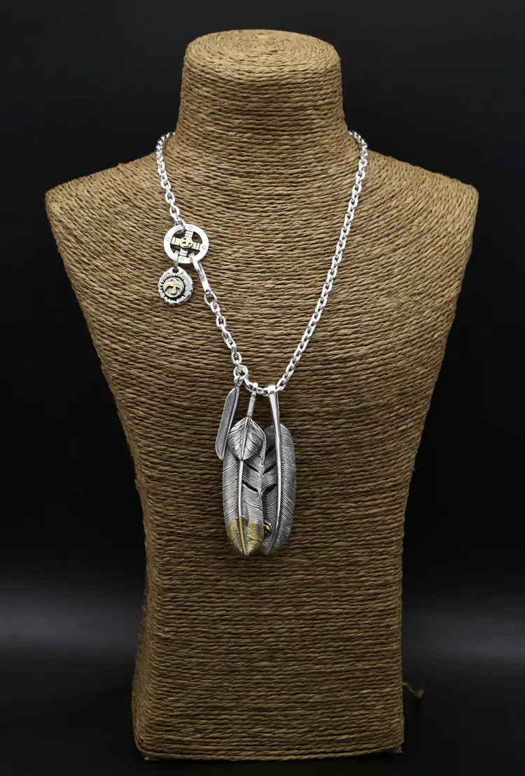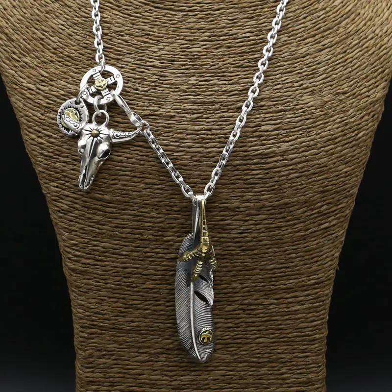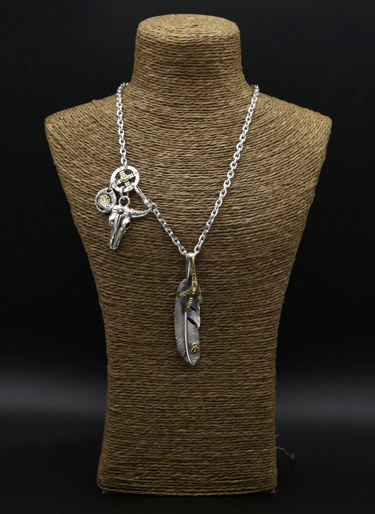 Silver Pendant Necklace Feather Bull Head Vintage Style 279