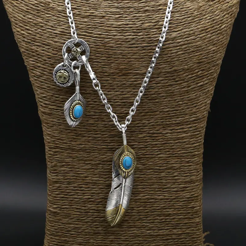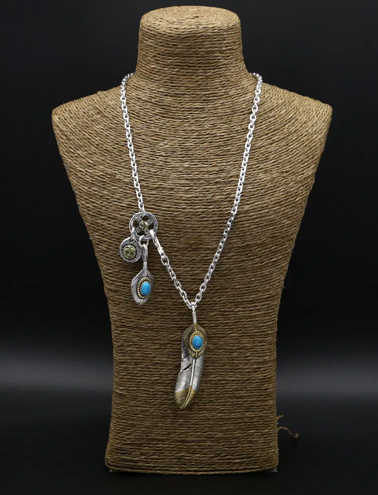 Silver Pendant Necklace Feather Turquoise Stones Vintage Style 283