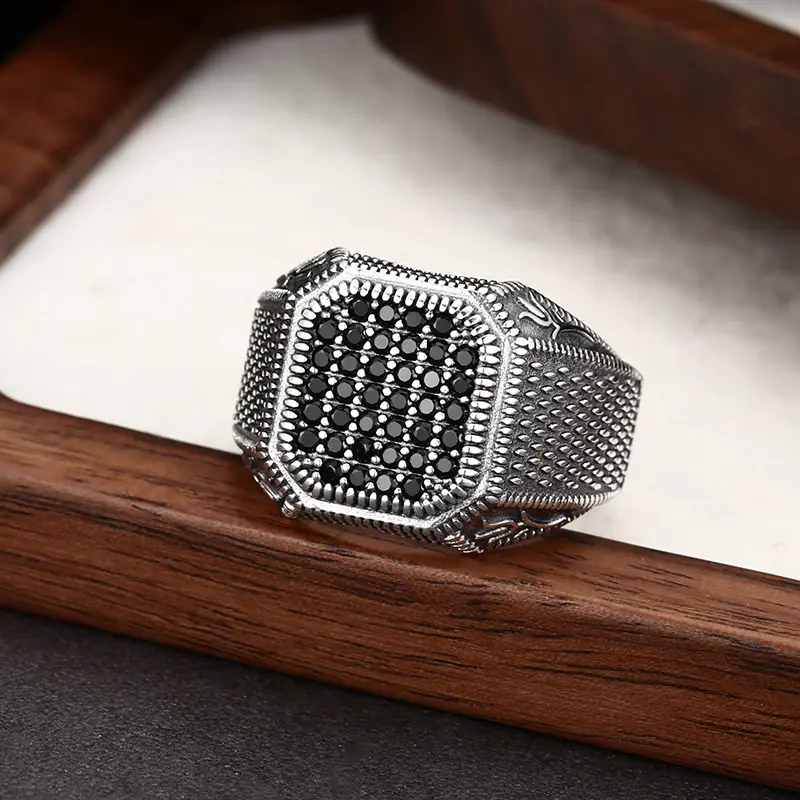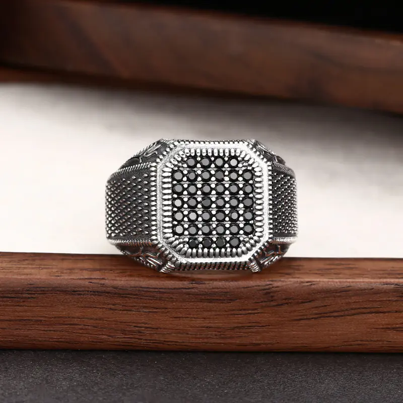 Silver Adjustable Rings Paved Black Stones Vintage Style 149