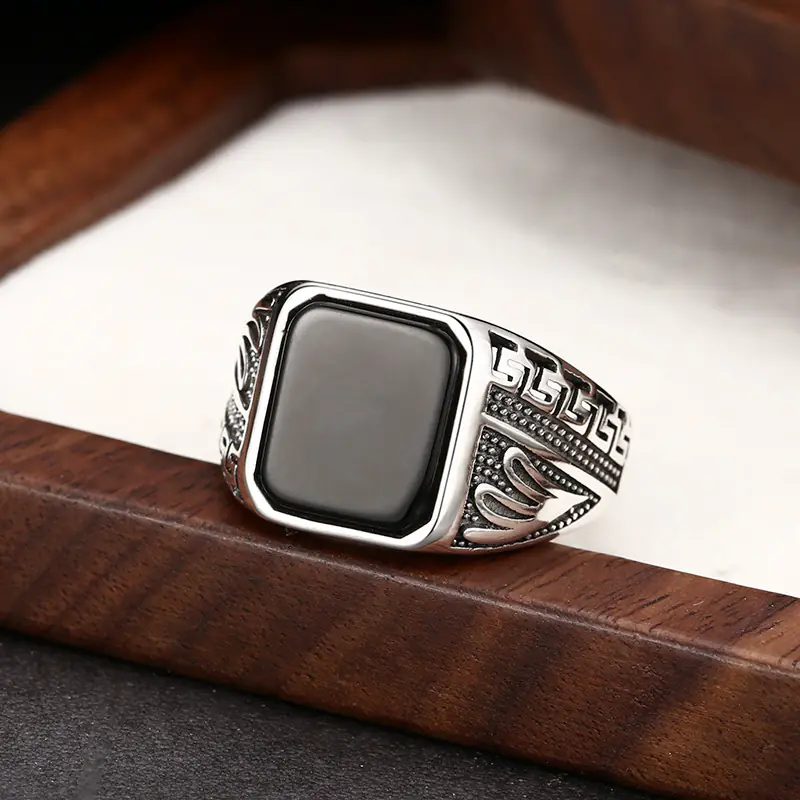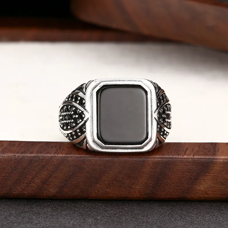 Silver Adjustable Rings Textured Black Stone Vintage Style 151