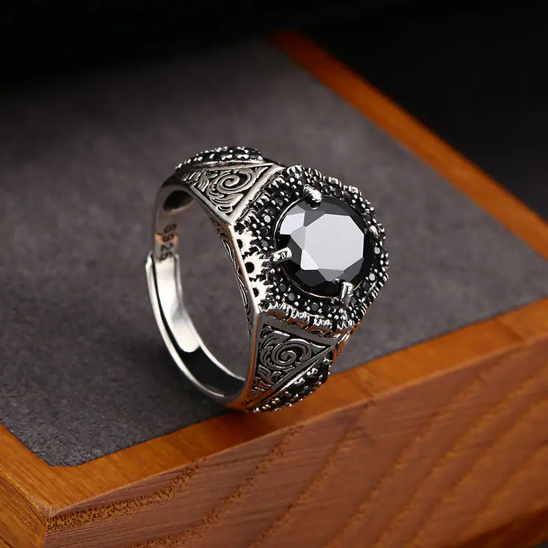 Silver Adjustable Rings Black Stone Vintage Style 154