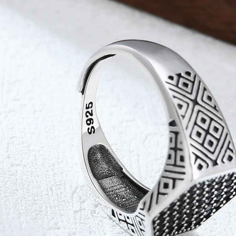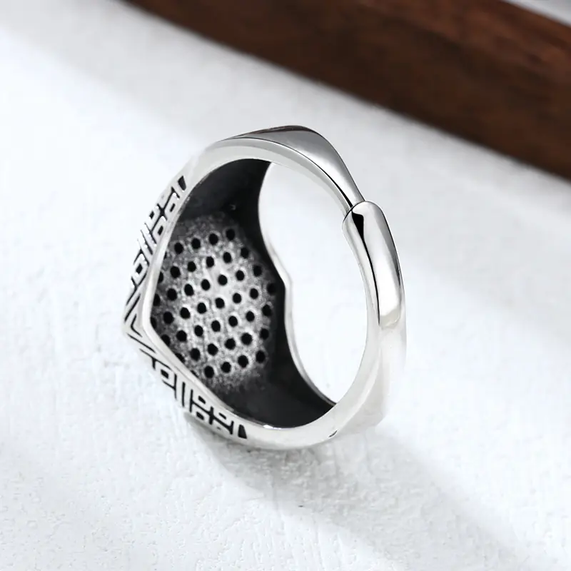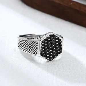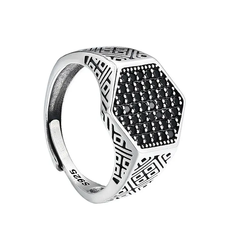 Silver Adjustable Textured Ring With Paved Black Stones 61