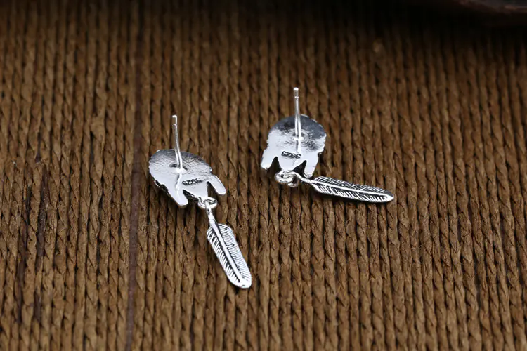Silver Dangle Earring Skull With Feathers Vintage Style 252
