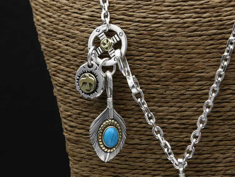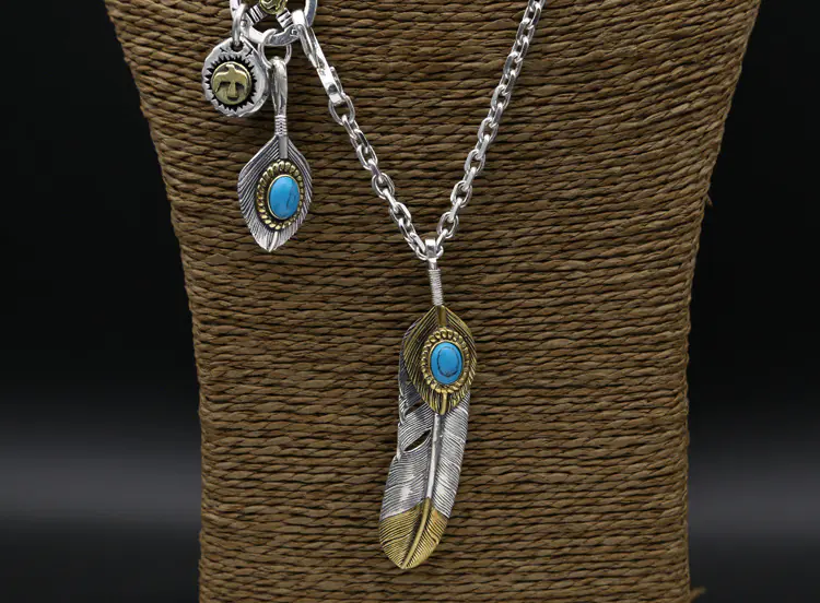 Silver Pendant Necklace Feather Turquoise Stones Vintage Style 283