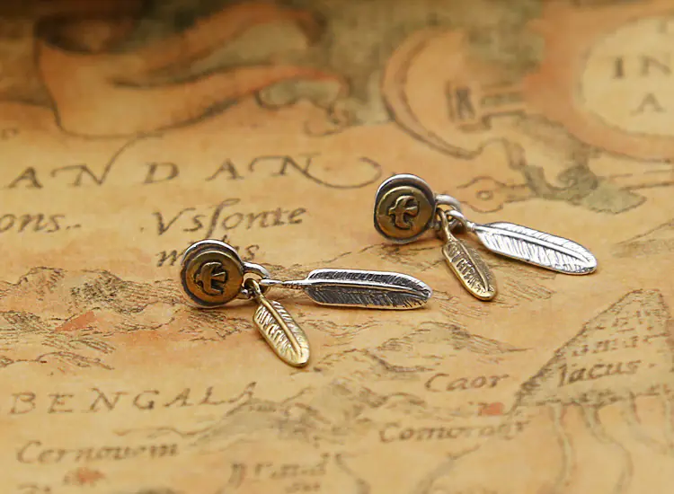 Silver Stud Earring Feather Charms Two-Tone Vintage Style 217