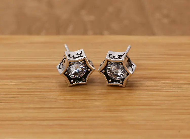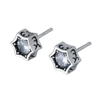 Silver Stud Earring Scroll Star Crystal Stones Vintage Style 244