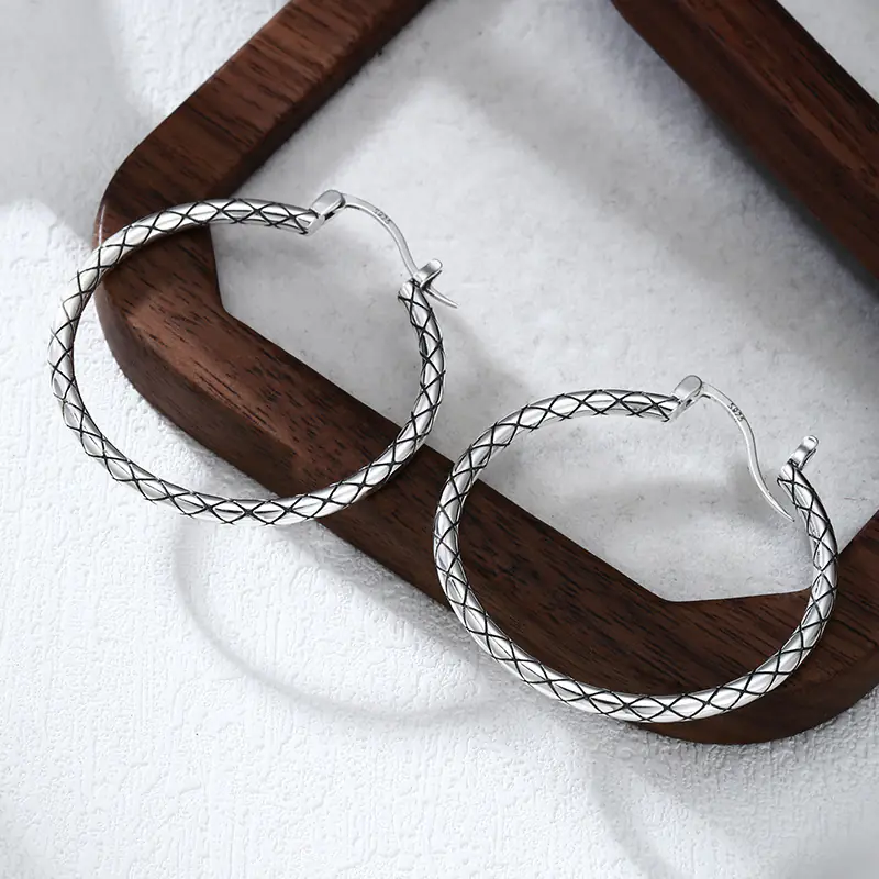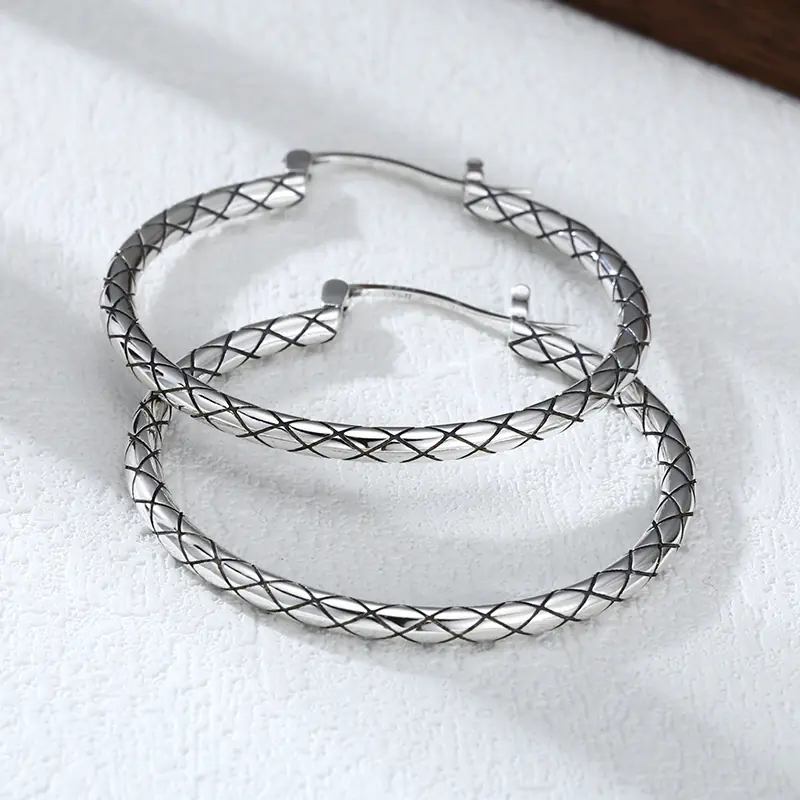 Silver Hoop Earrings Diamond Shape Textures Vintage Style 227
