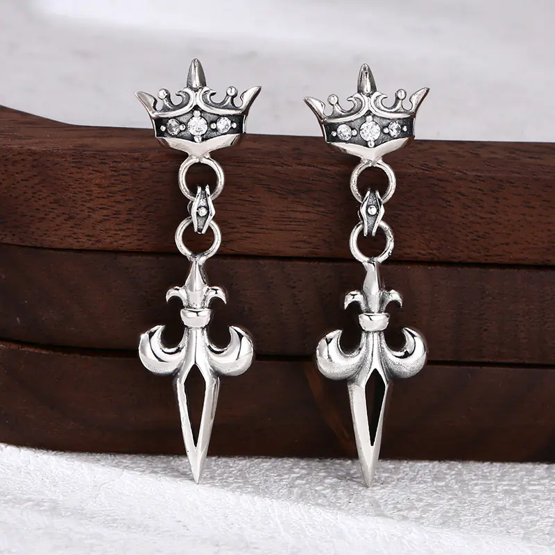 Silver Dangle Earrings Crown Spear Vintage Style 228