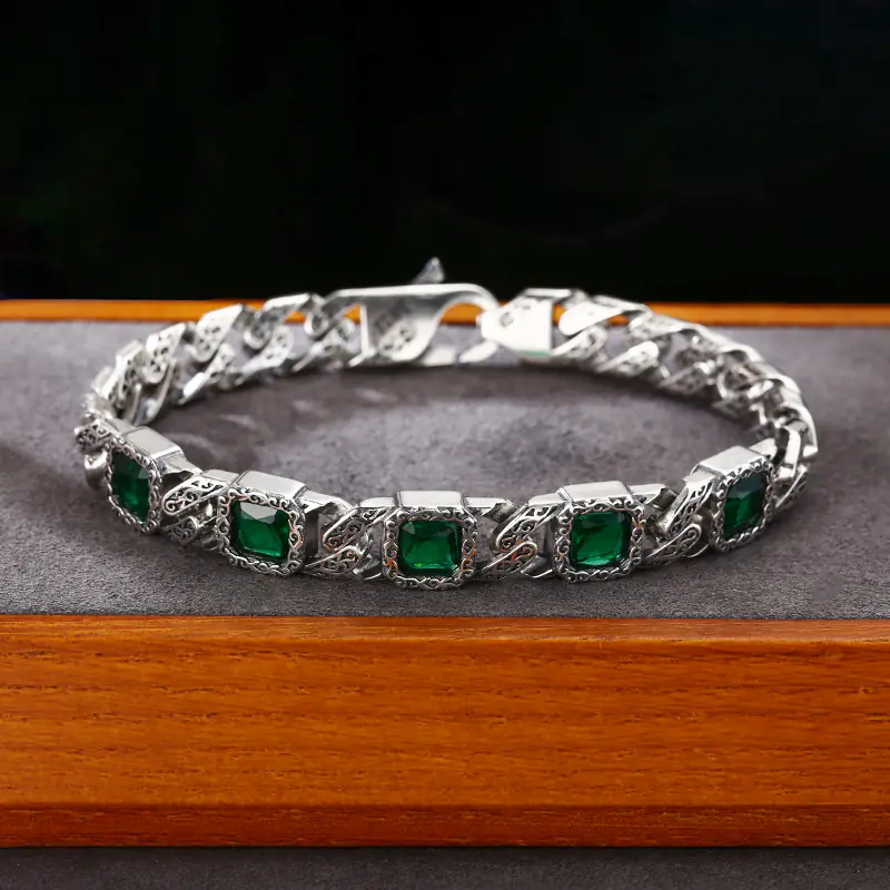 Silver Bracelets Scroll Links Green Stones Vintage Style 199