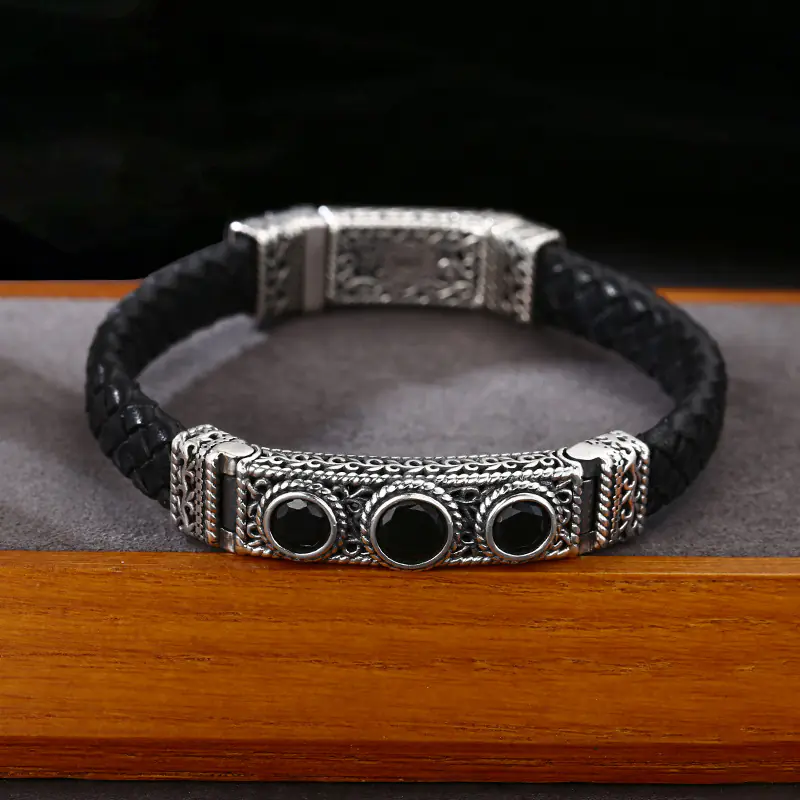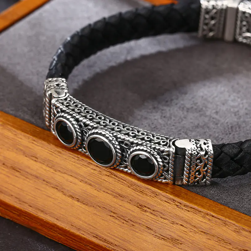 Silver Bracelets Braided Real Leather Band Scroll Charm Black Stones 202