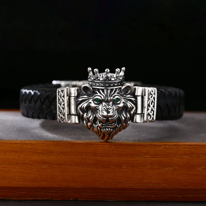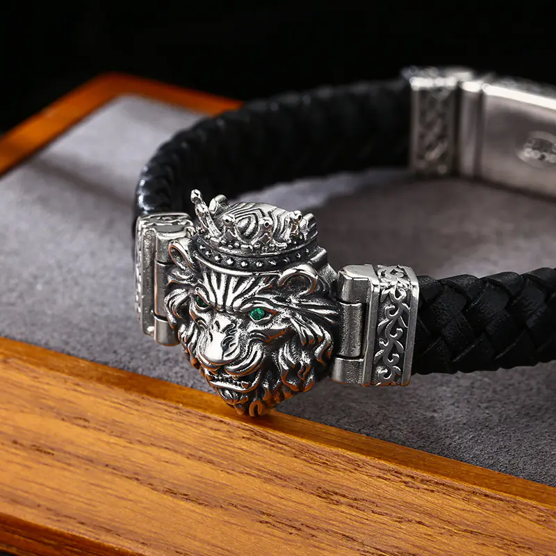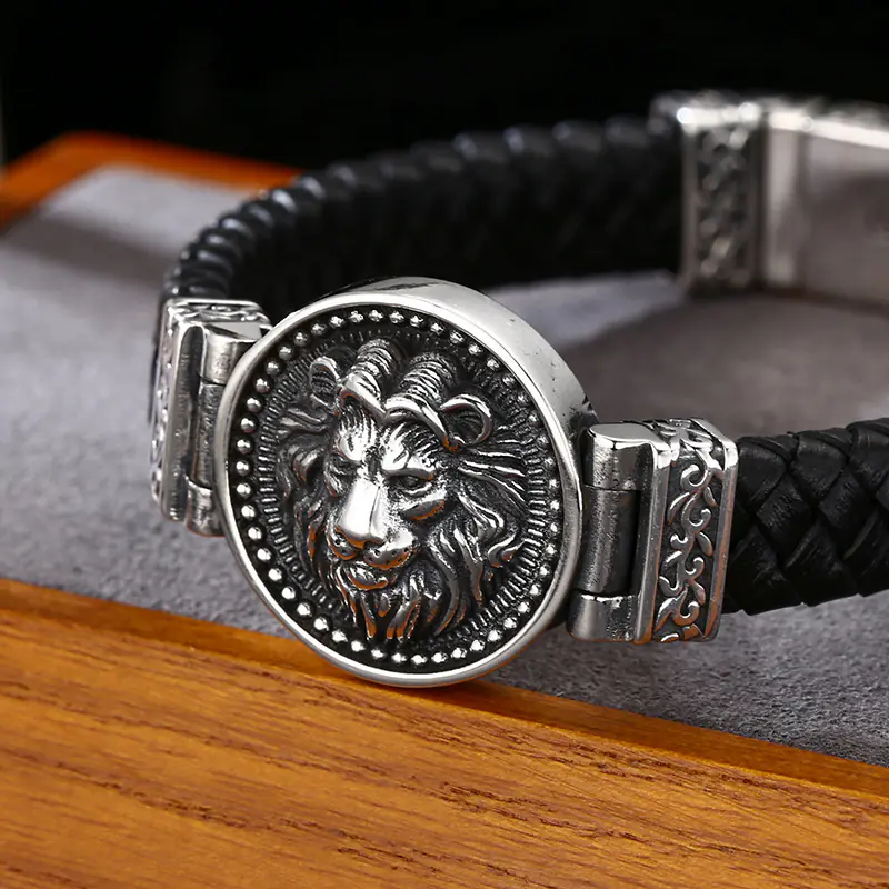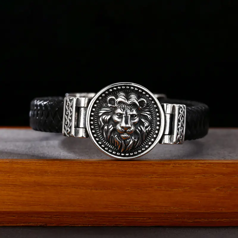Silver Bracelets Braided Real Leather Band Lion Head Charm 203