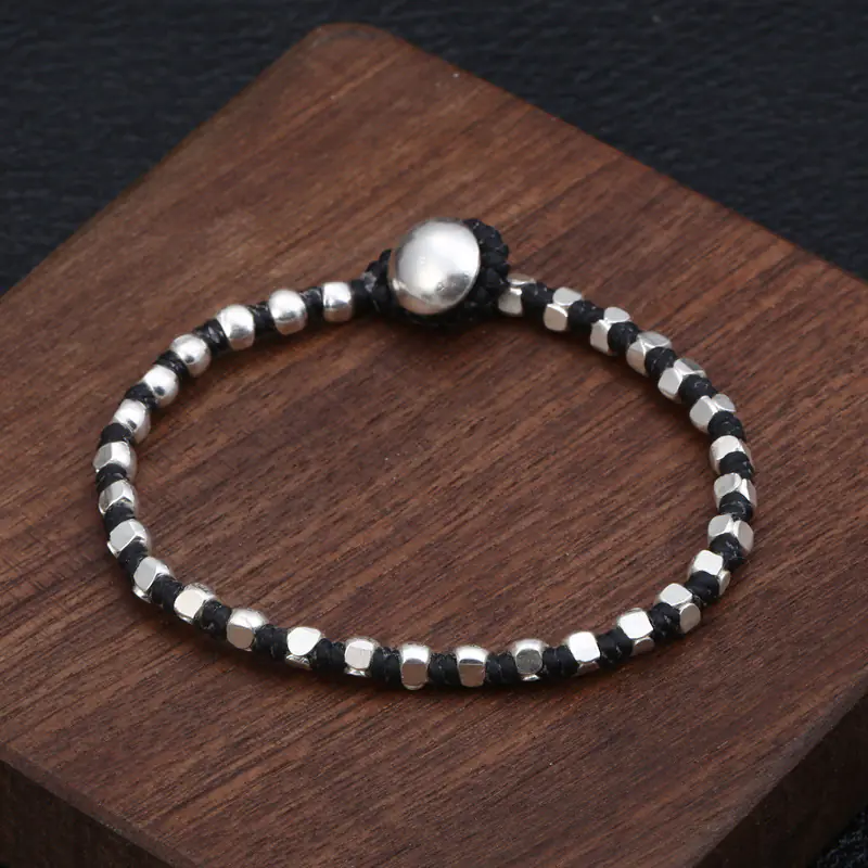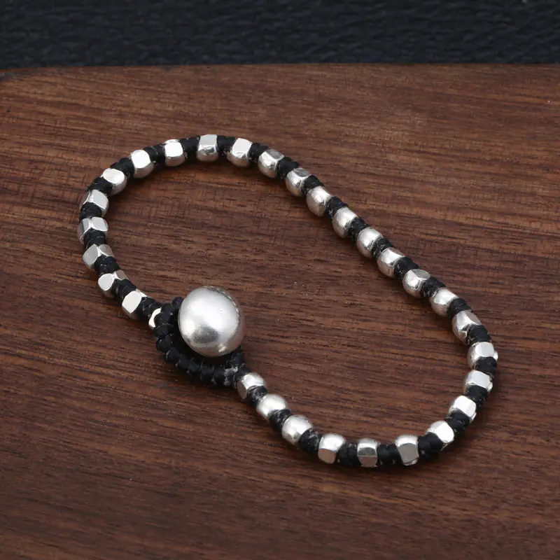 Silver Bracelets Silver Beads With Braided Wax Cord Vintage Style 193
