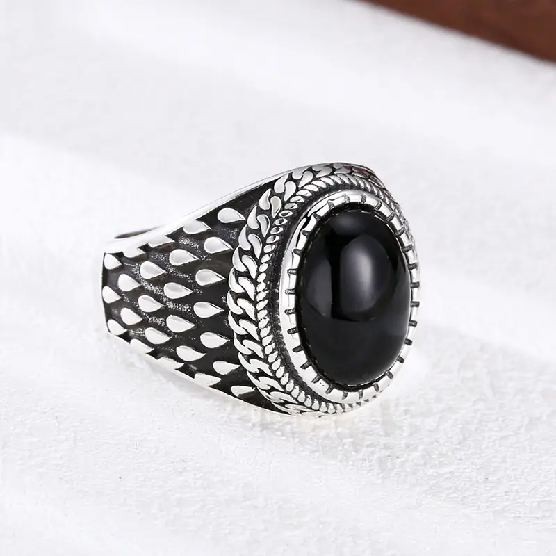 Silver Adjustable Textured Ring With Black Stone 64